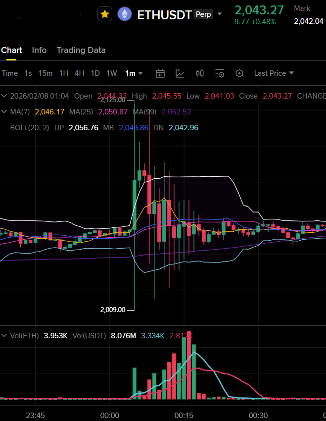 According to Binance Futures market data, around 16:10 UTC on February 7, 2026, the ETH/USDT perpetual contract suddenly broke out of its consolidation range near 2,050 USDT.