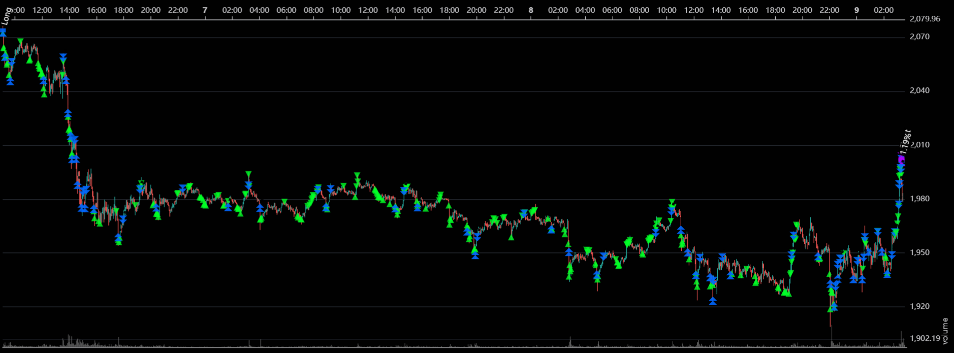 In the world of trading, the "One-Way Reversal" is a nightmare scenario. Imagine entering a Long position at 2072, only to watch the market immediately pivot and plummet to 1908—a brutal 8% decline (from 2080 to 1908) without a significant bounce.